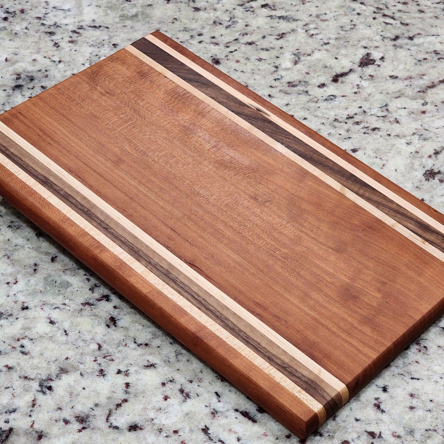 Built for prep, styled for memory—this Cherry cutting board blends everyday utility with timeless warmth. The handcrafted design features a rich Cherry base accented by Maple and Walnut strips, creating a balanced visual rhythm that feels both classic and personal. Every board from 467 Woodworking carries a story—born from a journey through anxiety and healing, and built to bring warmth and meaning to your kitchen.